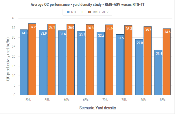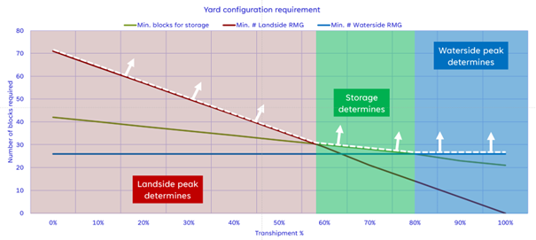For automated terminals using technologies like (automated) Rail Mounted Gantry (RMG), the relationship between transhipment volume and yard demand creates interesting dynamics. At lower transhipment percentages, landside operations typically determine the critical demand on the yard. As transhipment increases, waterside operations become the limiting factor.