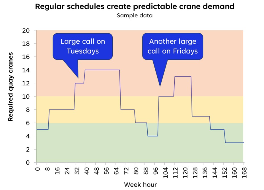 In this example, quay crane demand follows a clear weekly cycle. About one-third of the time, six or fewer cranes are active; another third requires 7–10 cranes; and the final third demands more than 10 cranes. With such a regular schedule, terminals can allocate FTEs efficiently, plan maintenance in quieter periods, and even attract additional volume when capacity is available.