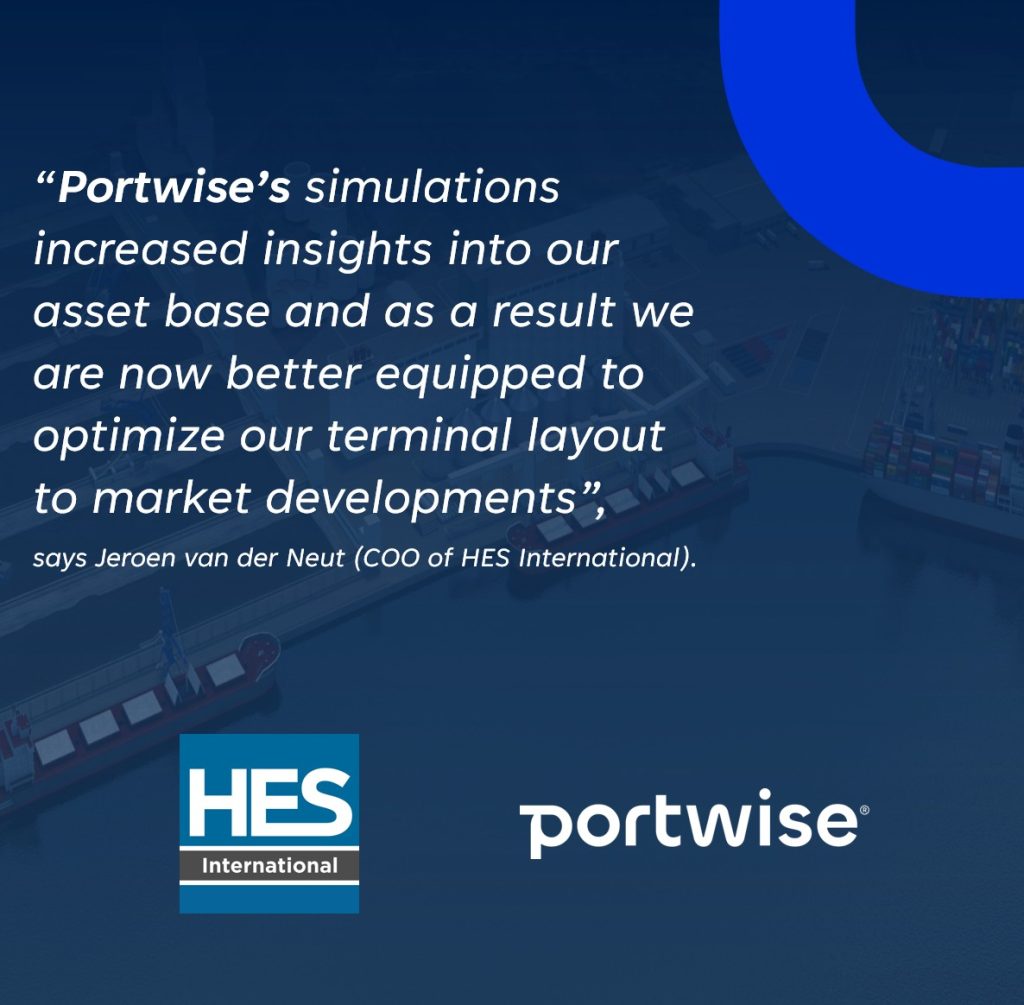 ‘’Modelling the majority of our terminals has proven to be a crucial step in the development of HES International’s long-term asset plan. Portwise’s simulations increased insights into our asset base and as a result we are now better equipped to optimize our terminal layout to market developments. Further simulation will only enhance our understanding of bottlenecks and capacity in our core processes’’, says Jeroen van der Neut (COO of HES International)