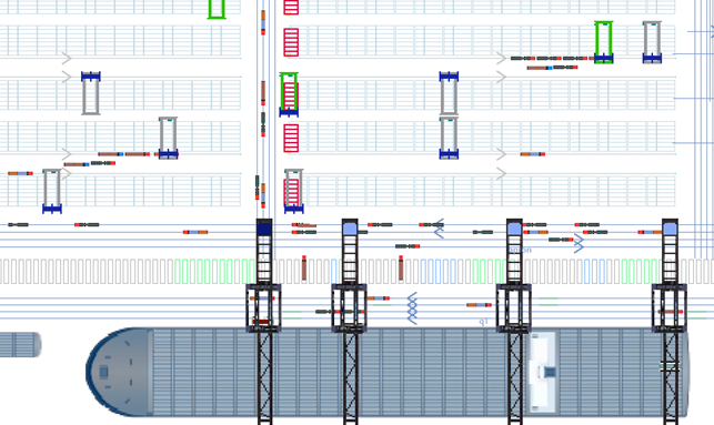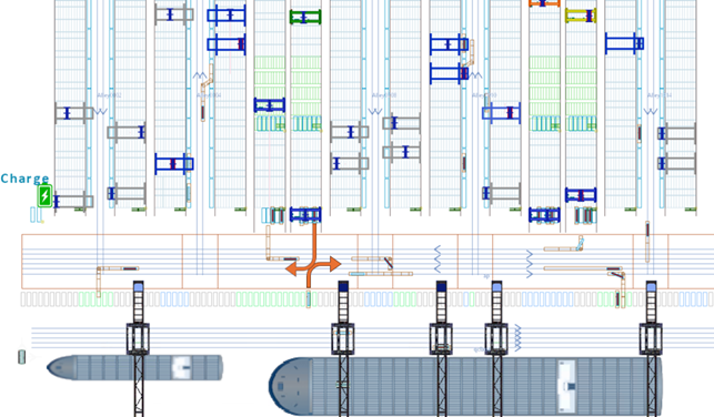 - If there is sufficient space at the apron, terminal layouts with AVs can use buffer positions near the quay cranes for AVs to wait without hindering other AVs. AVs may wait here when they have no new destination yet or when they have no clearance to proceed to their next destination (e.g. to a quay crane with an out-of-sequence container). Routes to and from these buffers often conflict with each other. Portwise designed a buffer-selection strategy that reduces conflict routes between AVs when driving to or from the buffers. This logic reduced delay time in the buffers significantly in busy areas in the simulation model.